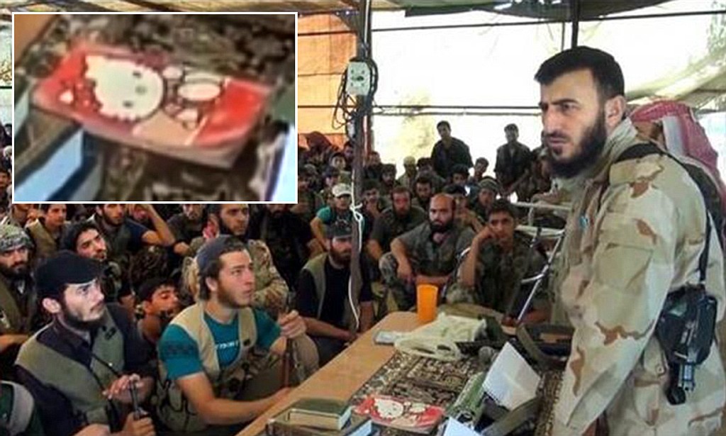 Syrian rebel leader delivers speech with a pink Hello Kitty notebook