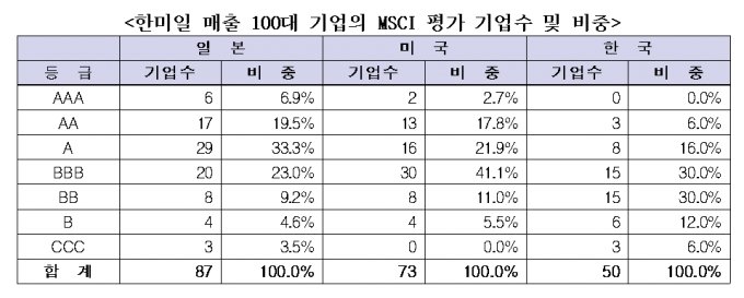 韓国全国経済人連合会は23日、「韓日米主要企業ESG格付け比較」報告書をまとめた。全経連は各国家別売上額100大企業の中でモルガン・スタンレー・キャピタル・インターナショナル(MSCI)の格付けが確認される企業を対象に今回の分析を進めた。韓国は50社、日本は87社、米国は73社だった。