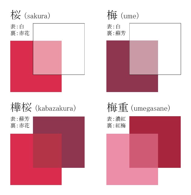 平安時代の十二単衣の使われてる重色(かさねいろ)で、「桜」と「梅」が入っているのがこちら。