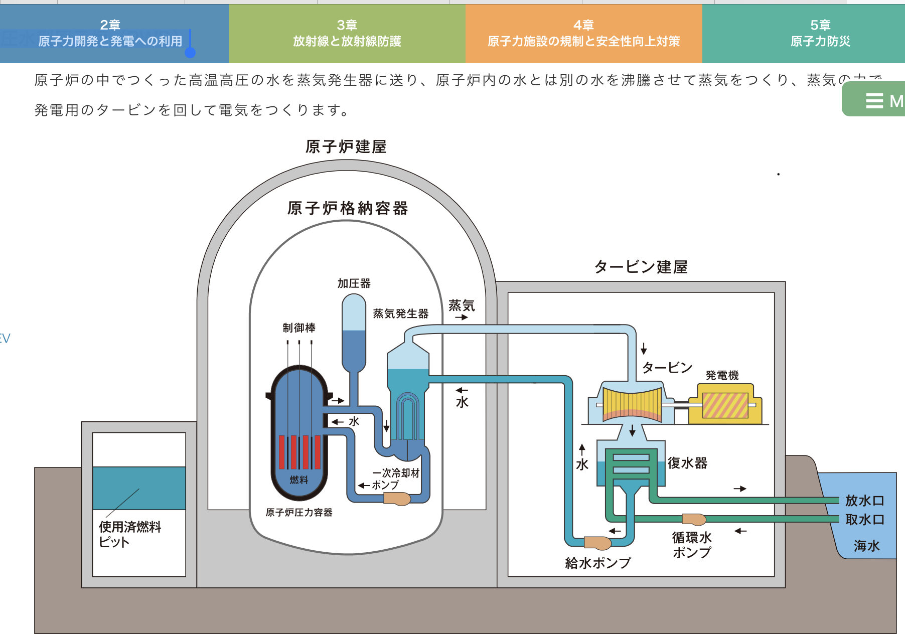 発電に利用された蒸気は放射性を帯びているため、蒸気を回収し再循環させるだけでなく、タービン建屋(たてや)など、これに関わる全ての系を堅牢に遮蔽することで、放射能が外部に漏れることを防いでいる。主に蒸気によるシールで遮蔽しているが、その蒸気は重油を燃焼させたり、電気を利用して発生させている。
