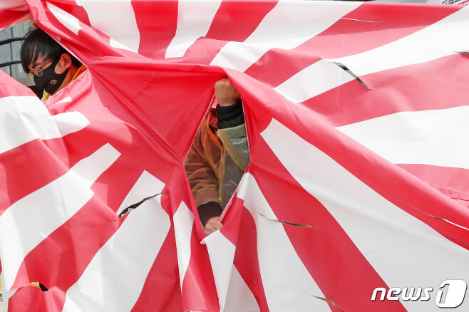 旭日旗は日本が太平洋戦争·第二次世界大戦期間に使用した旗で、日本の軍国主義を象徴する戦犯旗である。 現在も、日本の陸上自衛隊と海上自衛隊の軍機として使用されている。