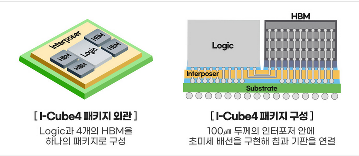 - 삼성전자가 선보인 독자적인 2.5D 패키지 솔루션 브랜드로, I-Cube 뒤에 붙는 숫자는 HBM 칩의 개수를 의미함