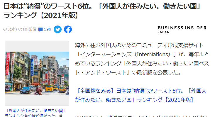 また、「仕事環境」も世界50位(ワースト10位)で、あるアメリカ人居住者は「ワークライフバランスは世界最悪だ」と答えているが、それは多くの日本人が感じているところだろう。