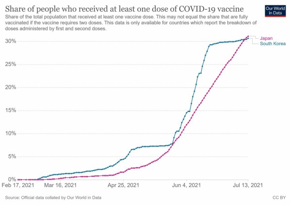 日本の新型コロナワクチン接種率が韓国を追い越した。接種完了率は既に先月18日に逆転されていたが、1回目接種率も追いつかれたのだ。