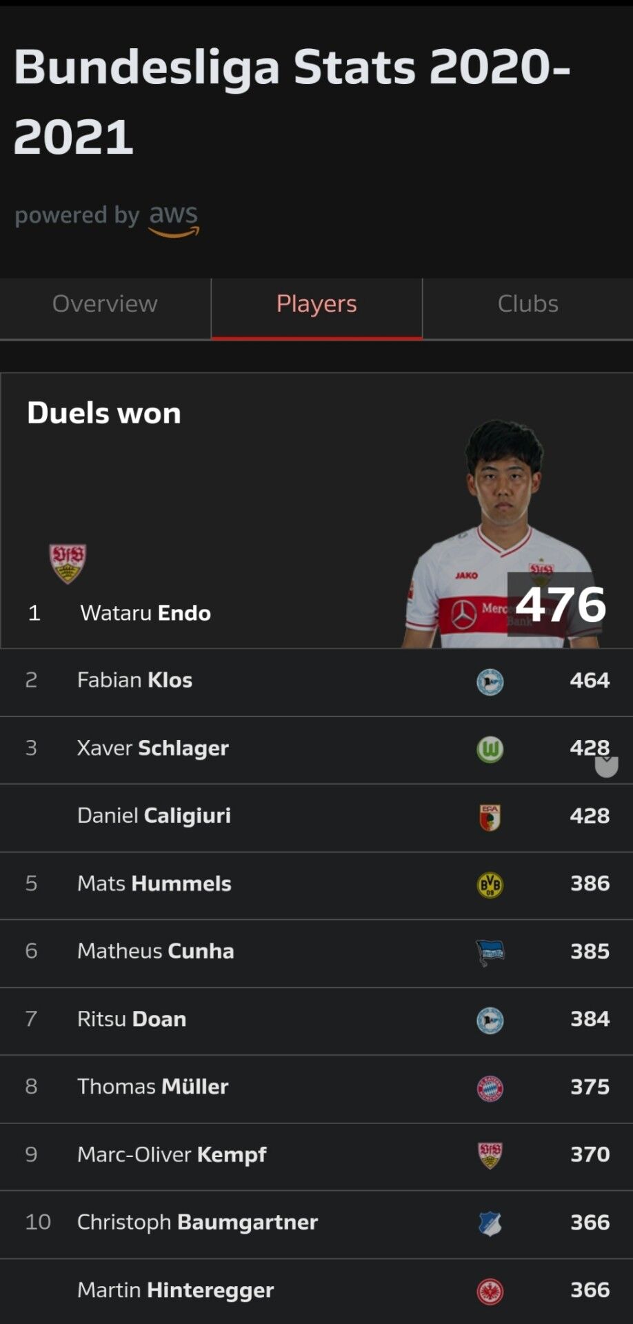 2020-2021シーズン ブンデスリーガデュエル勝利数ランキング1位 遠藤航
