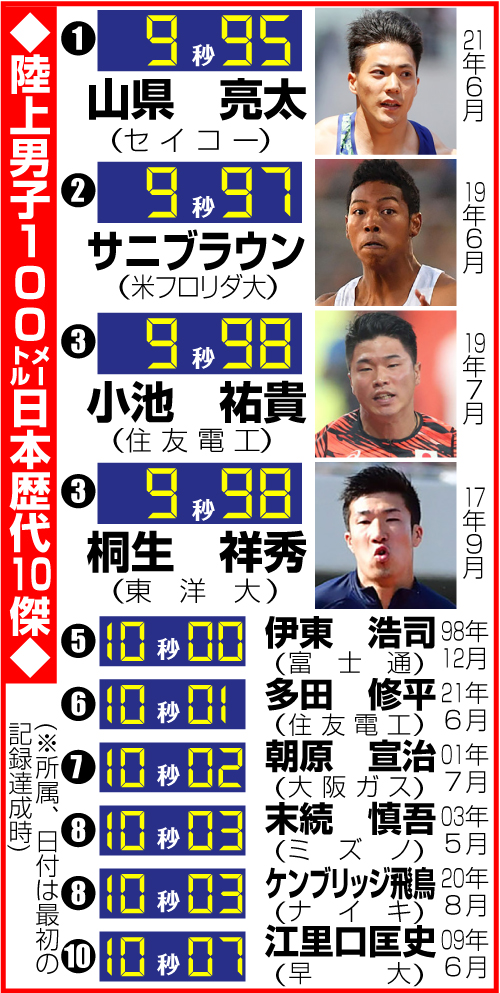 山県亮太9秒95日本新!日本人4人目9秒台、ついに「10秒の壁」突破