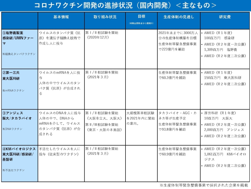 日本では、2021年2月に国内初のワクチンとして特例承認され、6月7日段階で1600万回以上の接種が完了している。2021年中には、ファイザー・ビオンテック製のワクチンが合計1億9400万回分供給される見込みとなっている。