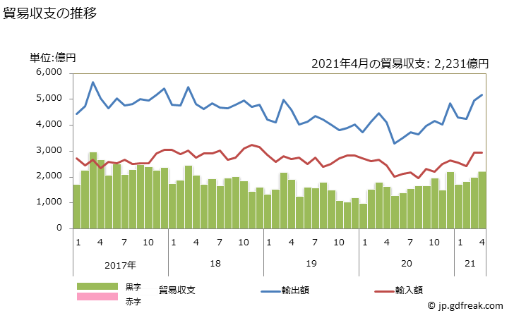 2021年1月から4月までの日本の対韓国貿易黒字額は、7,809億円の黒字。黒字幅は前年の同期間に比べ30.5%拡大。