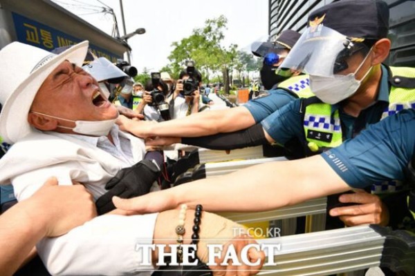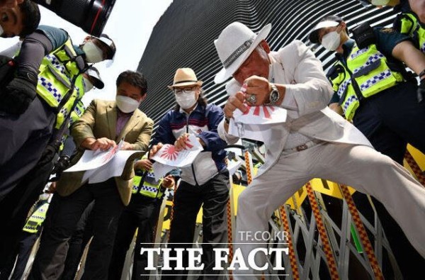 (ソウル=ニュース1)移動記者=五千も愛国国民大連合代表が8日午後、ソウル鍾路区在韓日本大使館前で独島を日本領土と表記した東京オリンピックを糾弾し旭日旗(戦犯期)を燃やし懸念も警察から制止あう品の中で、コチュジャンを取り出している。オ代表はこの日、日本に辛さを示すために持ってきたと述べた。