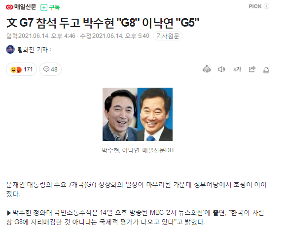 これは主要7カ国と韓国・オーストラリア・インド・南アフリカ共和国の首脳がコロナ19により距離を置いて撮った記念写真を編集しながらムン・ジェイン大統領をもっと浮上させるための画像を作るが「外交的欠礼」を負債とみられる。編集過程で菅義偉日本の首相の姿も記念写真の端に移された。文化体育観光部の関係者は、「(ページ)のデザイナーがドア大統領を写真の中には少し移動のために作業をして行われたこと」とし「誤ったイメージであることを後で認知してページに謝罪文を上げて元の画像に画像を再作成上げた」と釈明しした。この手の記事は、とても気持ちが良い。