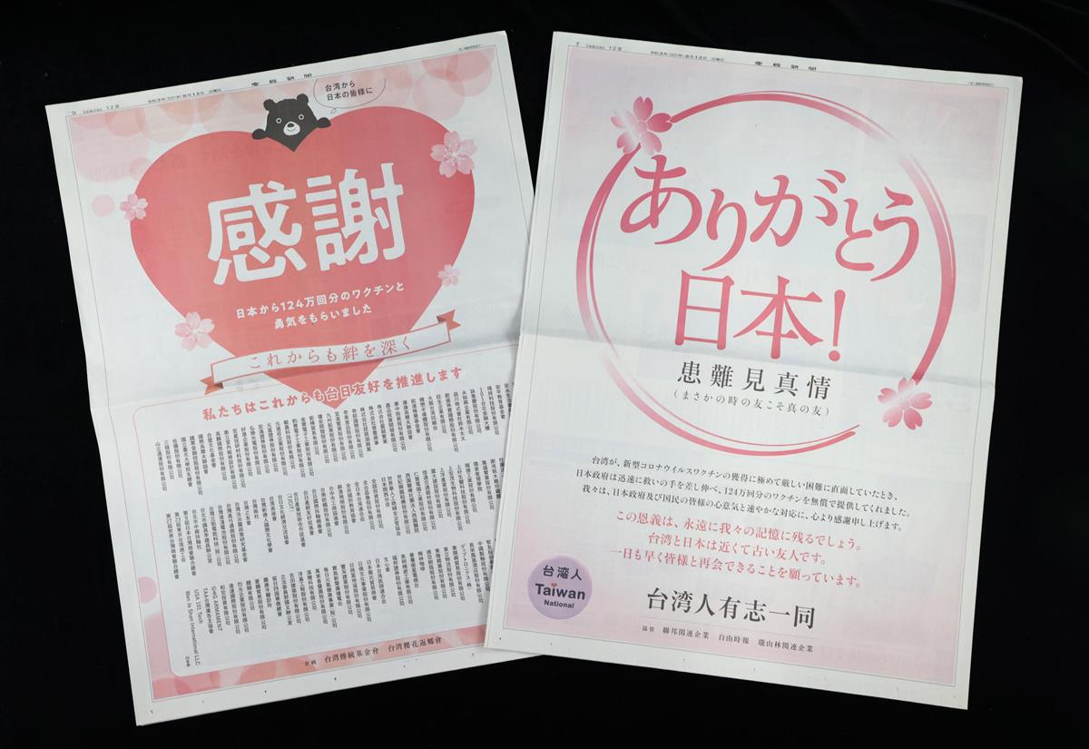 13日付の産経新聞に「ありがとう日本!」などと題した2枚の全面広告が掲載された。新型コロナウイルスワクチン124万回分を台湾に無償提供した日本政府と国民に対し、感謝の気持ちを伝えるため、約130の台湾系企業、団体などが共同出資して掲載されたものだ。