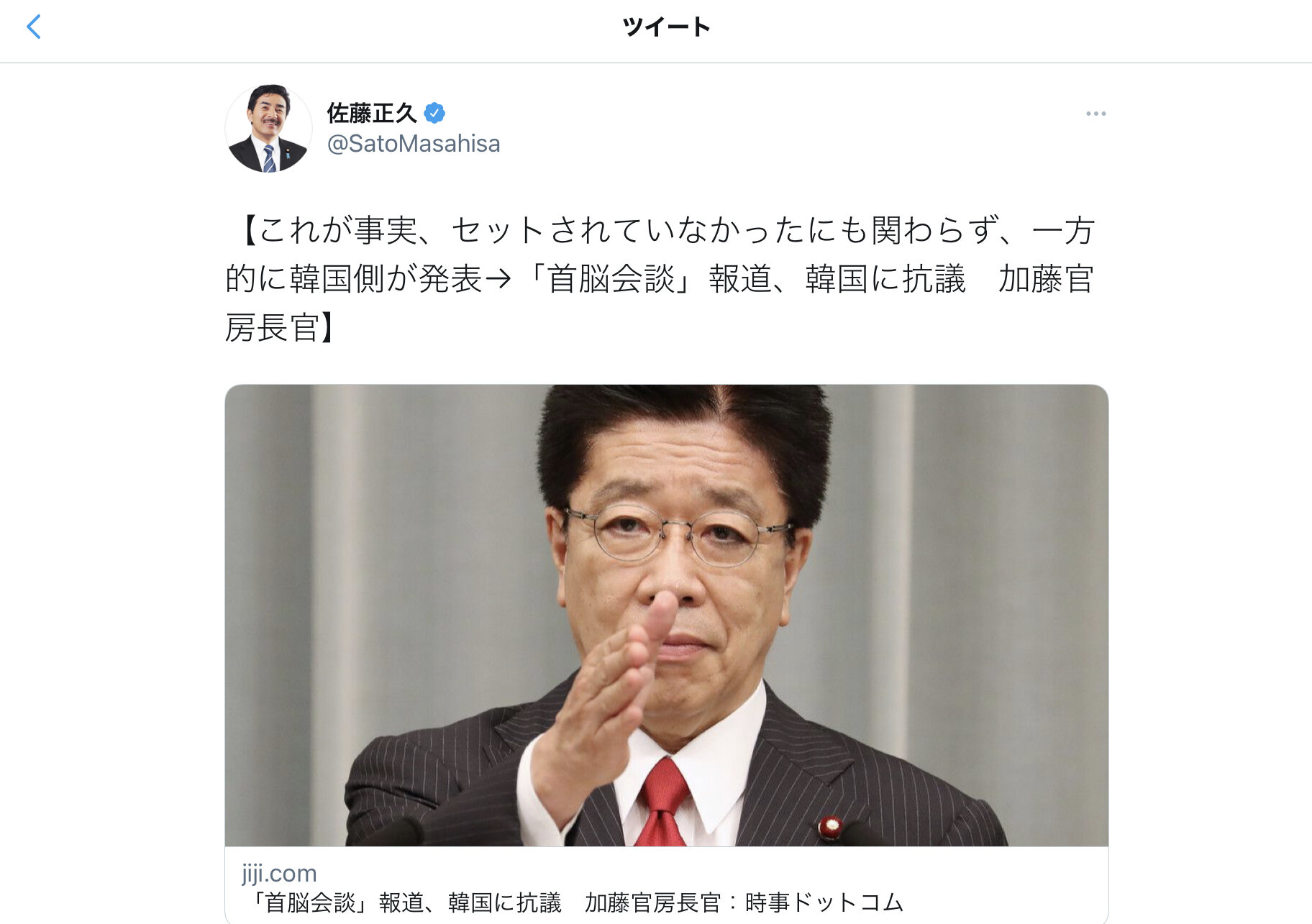 加藤氏は「事実に反するのみならず、一方的な配信は極めて遺憾であり、ただちに韓国側に抗議した」と述べた。首脳会談は日程などの都合で実施できなかったと説明した。