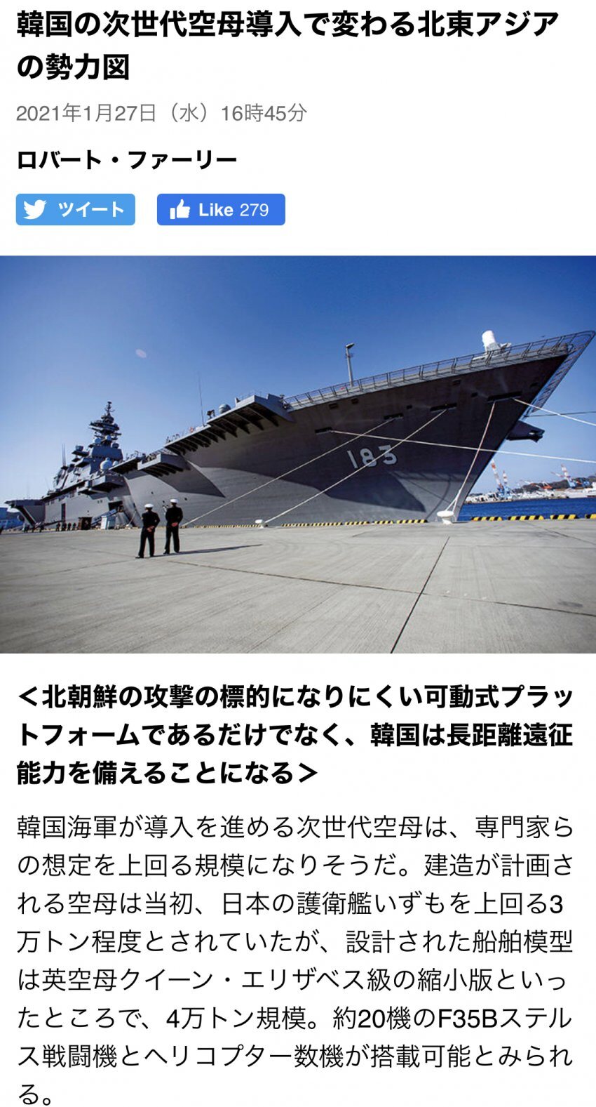 기사 제목은 ’한국의 차세대 항공모함 보유로 바뀔 동북아시아의 세력 구도