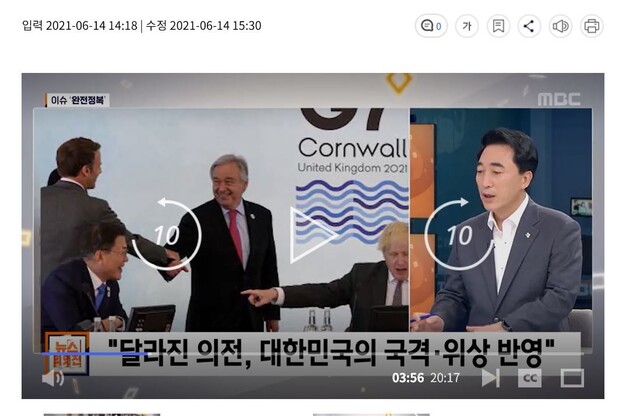 이 글에는 “스가 총리는 어디 있나”, “한국이라는 나라 자체의 신뢰도가 보이는 장면” 등의 댓글이 달렸다. 이 장면이 찍힌 확대회의는 코로나19 대응을 다루는 ‘보건’ 세션이었다. 7월 도쿄올림픽 개막을 앞두고 스가 총리는 코로나19 방역에 총력을 기울였지만, 주요 7개국 회원국에 견줘 백신 접종률은 뒤처진 상태였다.>>20 日本語版出たわw