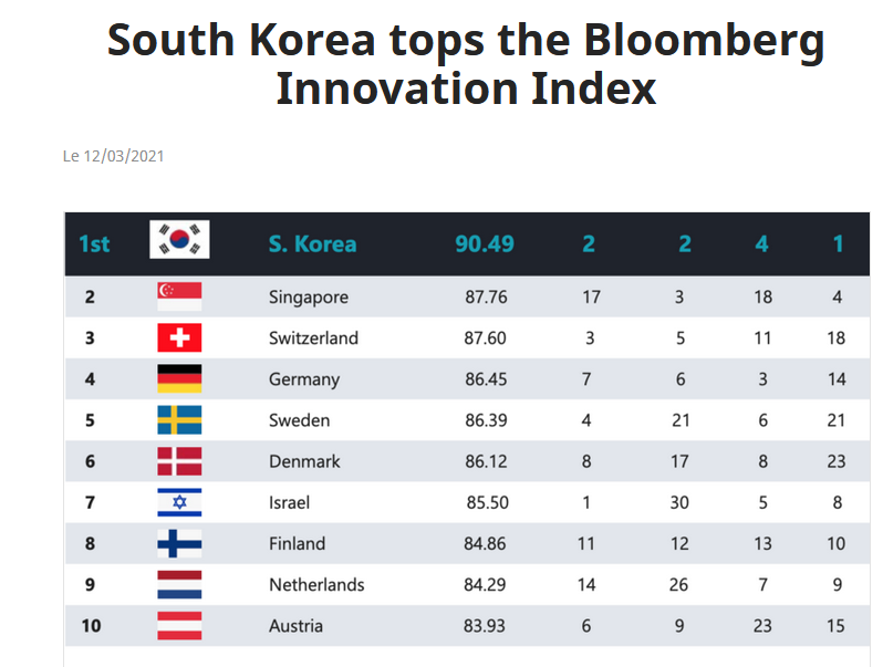 세계 1위의 통신사, 데이터베이스 회사인 Bloomberg(엄청난 통계자료를 가지고 있다.)가 매년 발표하는 세계 혁신 국가. 즉 정보통신산업을 비롯한 세계 경제 산업, 세계 미래 산업을 만들어내는 미래 먹거리 부자 국가에서 1위가 한국(지난 8년동안 7번 1위) 2위가 싱가포르 3위가 스위스 4위가 독일 일본은 12위