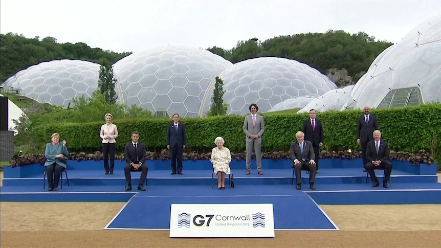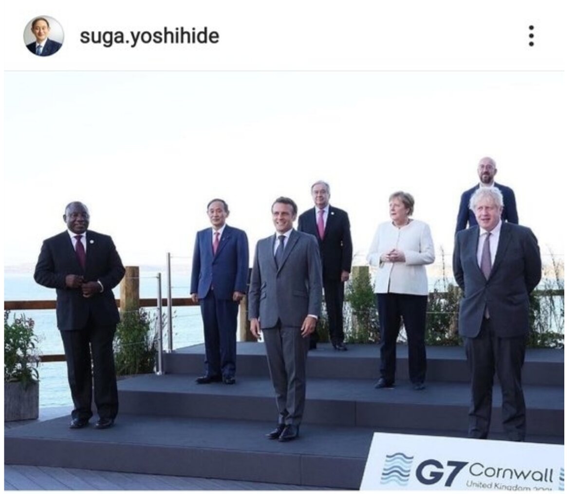 영국의 Boris Johnson 총리도 자신에게 초점을 맞추기 위해, 菅가 서있는 위치가 사진에서는 잘려나가서 보이지 않는 사진을, 본인의 트위터 계정에 업로드했다. https://twitter.com/BorisJohnson/status/1403809783468249089