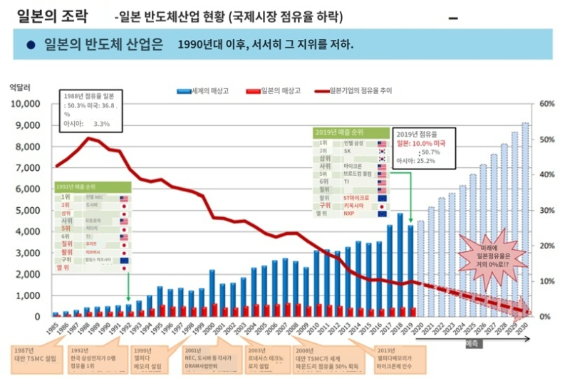 経済産業省主導によりソニーグループと半導体受託製造(ファウンドリー)世界最大手の台湾積体電路製造(TSMC)が合弁で熊本県に半導体工場を建設する構想が浮上した。経産省が仲介役となり、関係者の調整を進める。前工程中心で総投資額1兆円以上を見込む。ただ、誘致実現には欧米に見劣りする補助金など支援策の大幅拡充が不可欠。国を挙げた半導体サプライチェーン(供給網)再構築への本気度が問われている。일본의 전자제품은 8~90년대 이후 호황을 누리다 2000년대 들어서 몰락이라고 생각해요