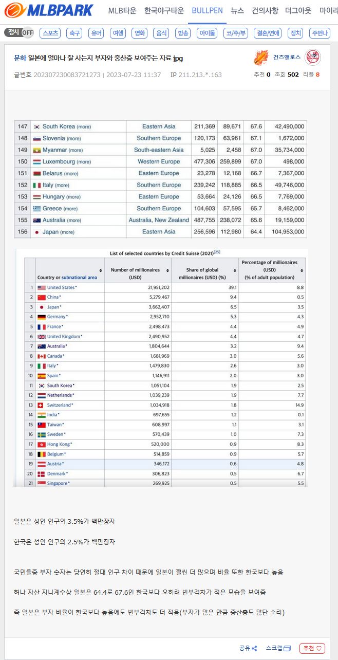 国民の中で金持ちの数は当然絶対人口差のために日本がはるかに多くて割合もまた韓国より高い
