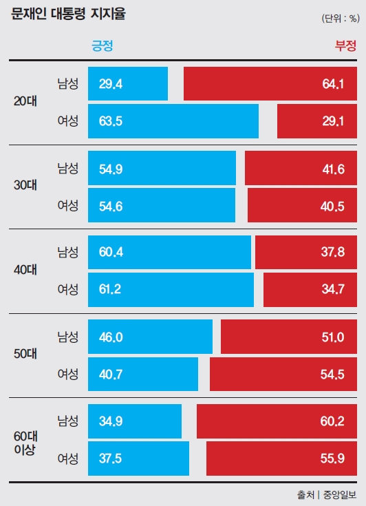 한국의 상황은 20,30대 남성들과 60대 이상 노인들은 문재인을 매우 싫어하는데,