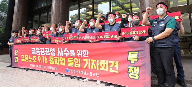 全国金融産業労働組合(金融労組)は14日、ソウル明洞銀行会館の前で記者会見を開き、「16日ストライキに突入できる準備を終えた」とし、6年ぶりに総ストライキを予告した。