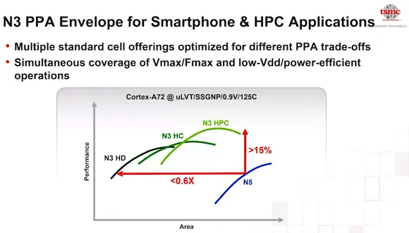 同社は最近開催した技術シンポジウムで、「N3」がスマートフォンとハイパフォーマンス・コンピューティング(HPC)の両方のアプリケーションを最初からサポートするように設計されており、高性能と高密度の両方が実現されると発表していました。>>1