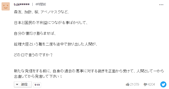 安倍晋三前首相は発売中の月刊誌「Hanada」で、東京オリンピック・パラリンピックについて、「歴史認識などで一部から反日的ではないかと批判されている人たちが、今回の開催に強く反対している」と批判した。具体的には共産党や5月の社説で中止を求めた朝日新聞を挙げた。