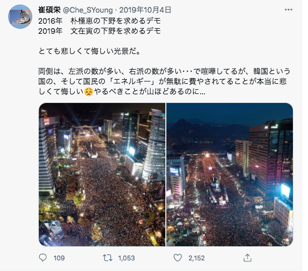 この分断は苛烈な物であり、個々人のレベルだけでなく地域的な分断も伴っている。大邱(テグ)市は保守、光州(クァンジュ)市は進歩という具合だ。