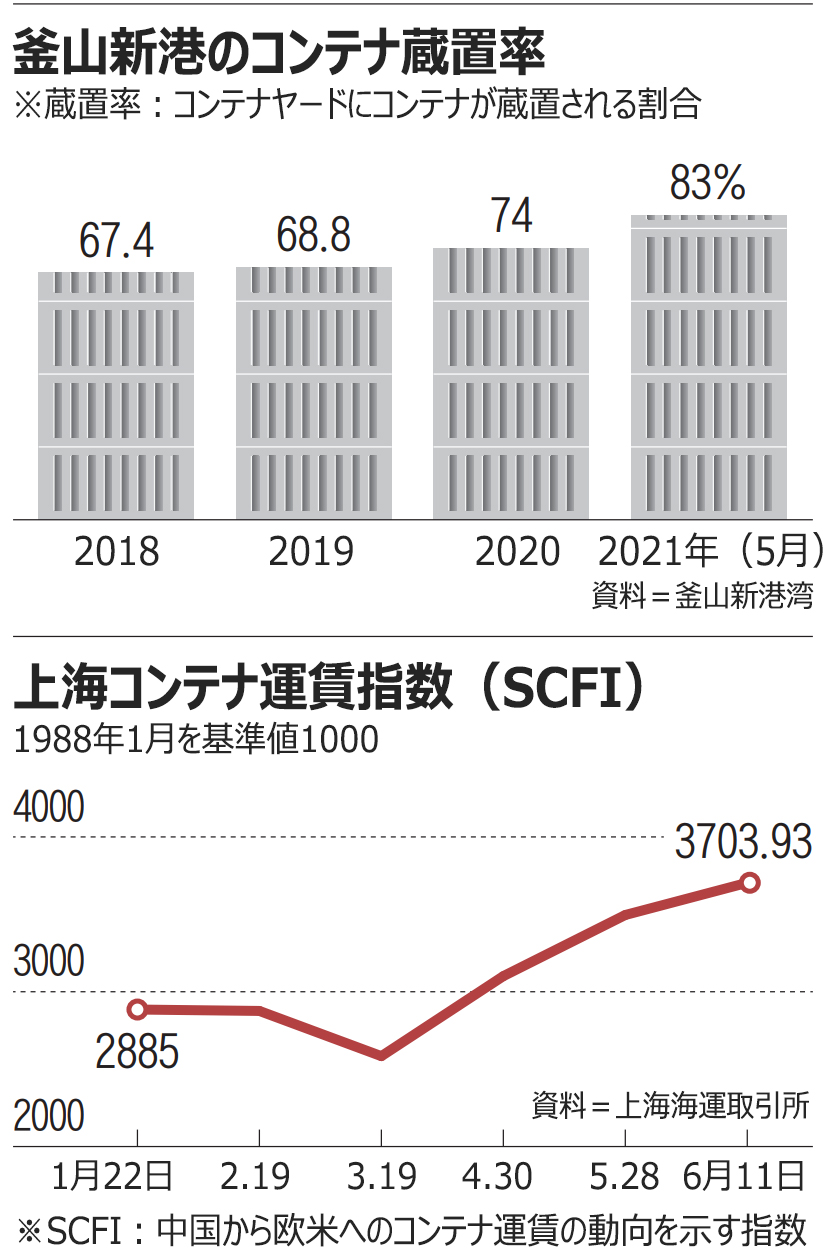 釜山新港関係者は「船舶不足、港湾混雑、空きコンテナの需給問題が重なり、海運物流の動脈が詰まりを起こしている。上半期よりも下半期の物流量が多いことを考えると、『海運大乱』はこれからが始まりだ」と話した。