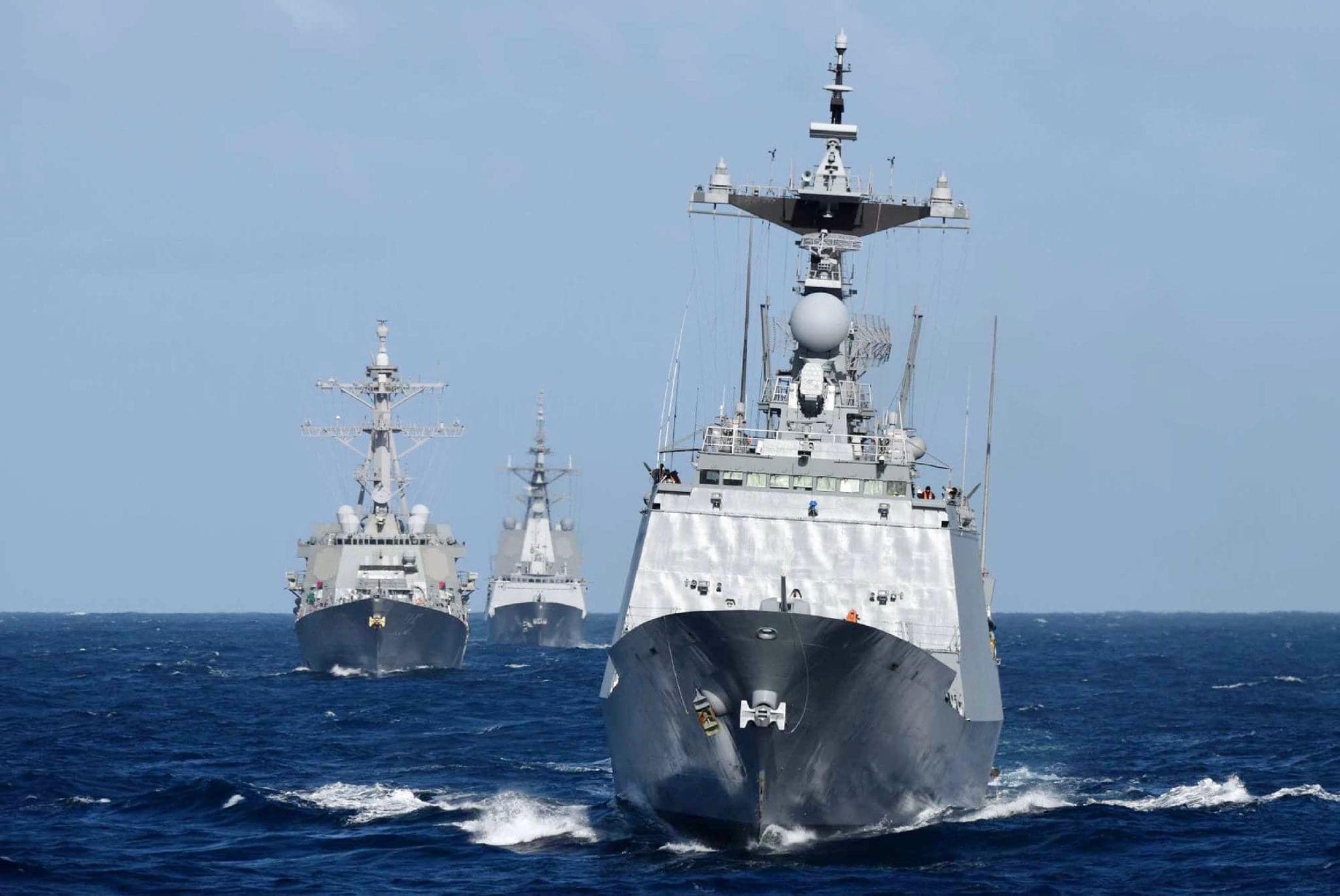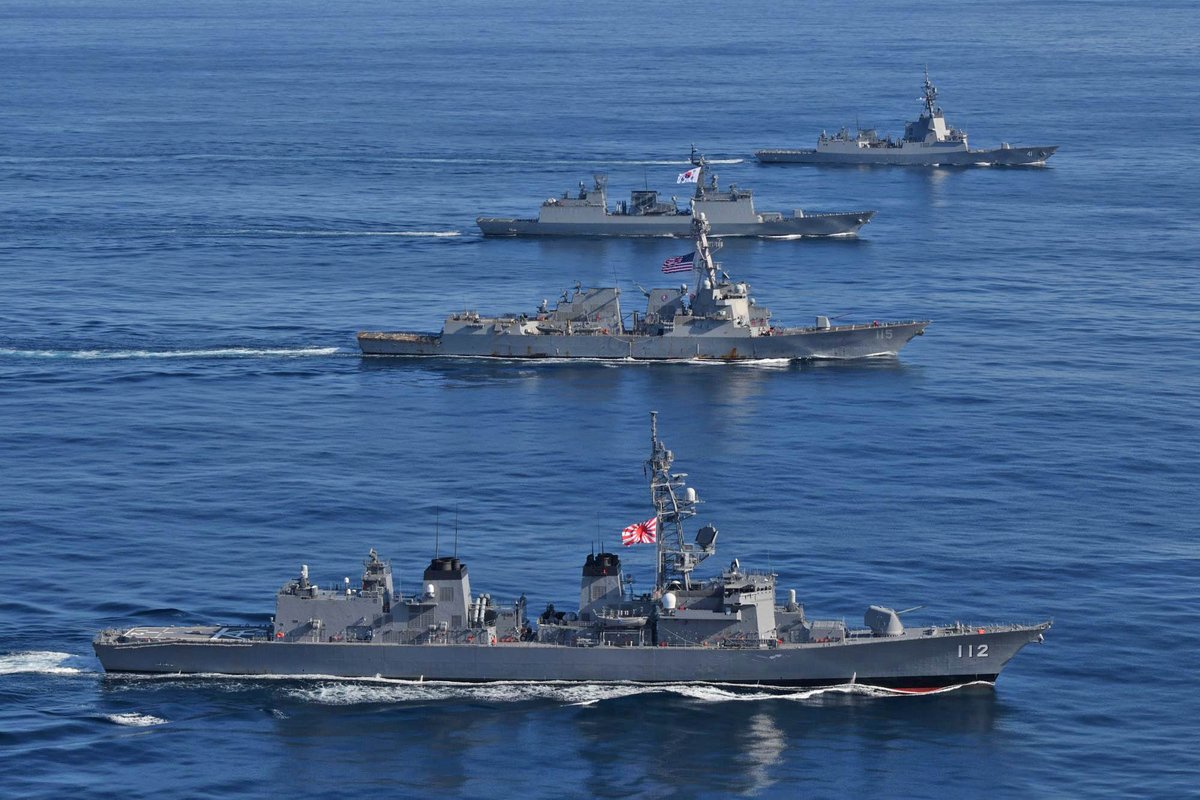 8日(現地時間)、オーストラリア東部海上で米第7艦隊が主催した「パシフィック·ヴァンガード」海上合同演習に参加した米国と韓国、日本、オーストラリアの4カ国海軍の駆逐艦が各国を象徴する旗を掲げて並んで航海している。