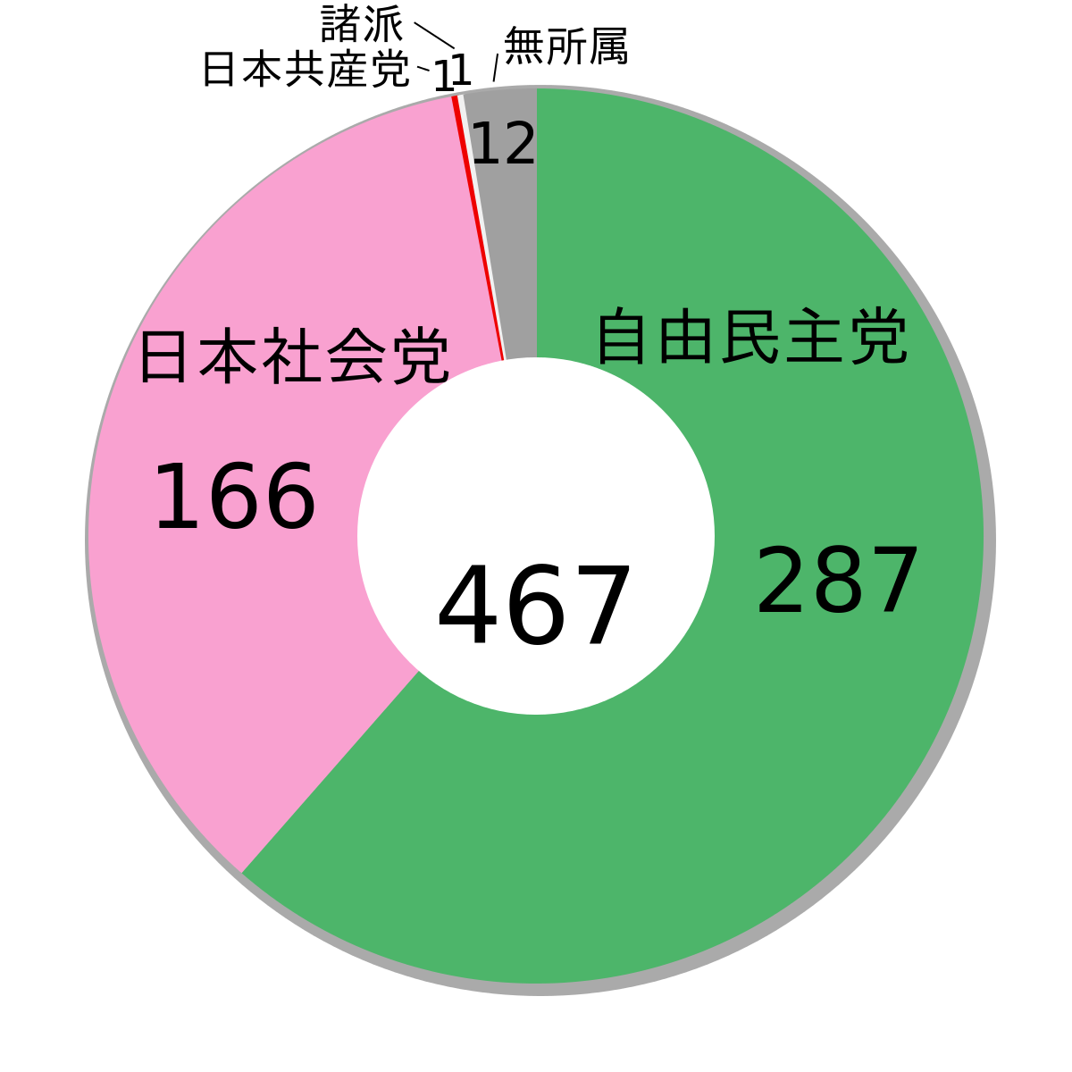 下に貼った円グラフは第28回(1958年)衆議院選挙の獲得議席数です。安倍晋三元総理のお祖父さん岸信介総理の時代です。この頃、日本でも反米、安全保障条約反対というスローガンで学生運動が活発に行われました。その影響もあり、自民党が287議席なのに対して日本社会党が166議席と負けてはいるものの非常に巨大な左翼勢力なのがわかります。