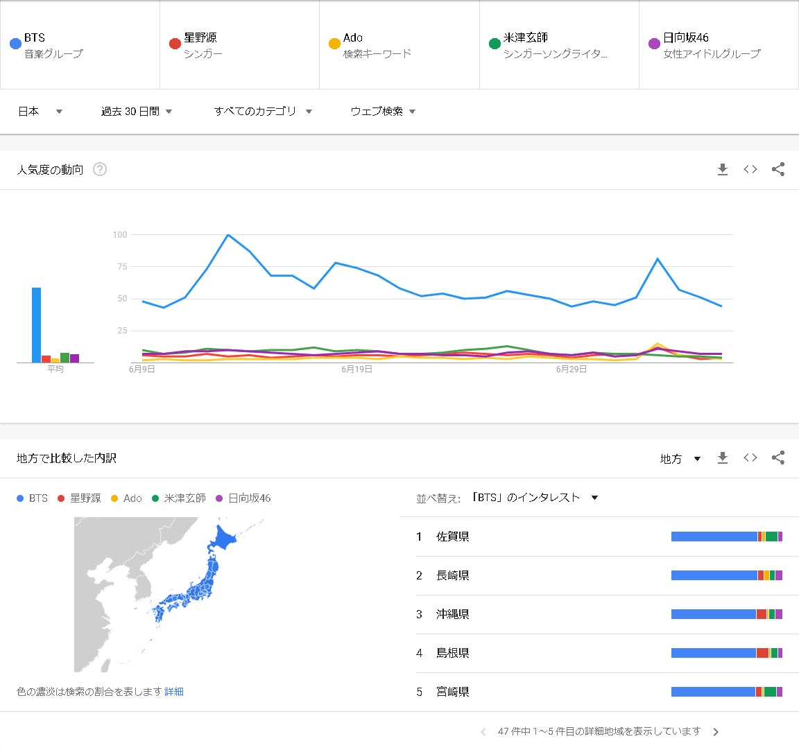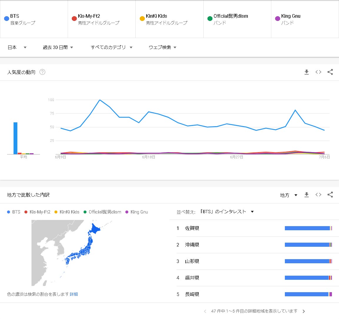 同時に、BTSの検索数がどれほど異常なのかも読み取れる。