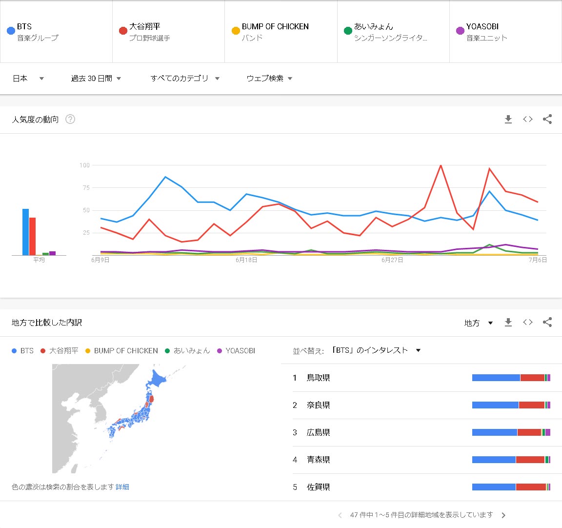 これらの結果から、大谷の検索数が人気アーティストを遥かに上回る、ということが読み取れる。