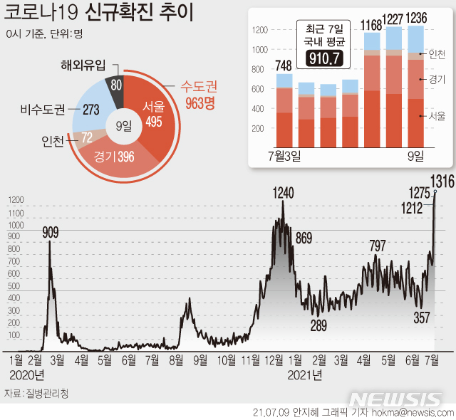 9日、中央防疫対策本部によると、この日の午前0時基準、新規感染者は1316人だ。このうち国内発生は1236人だ。海外流入の感染事例は80人である。この日の新規感染者数は、昨年1月20日、国内コロナ19の確診者が初めて確認されて以降、歴代最高値だ。前日(9日0時基準)発表された従来の最高値1275人をはるかに超えた。