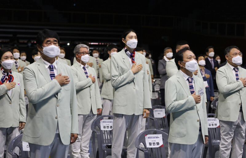 「コロナ19」状況で壮途につくことになる東京五輪大韓民国選手団は8日午後、ソウル松坡区(ソンパグ)のオリンピック公園オリンピックホールで結団式を行った。 同日の行事には選手団代表らをはじめ、金富謙首相や李起興大韓体育会長、張仁和選手団長らが参加した。 コロナ19拡散のため、種目別に指導者と選手、それぞれ1人ずつだけが行事に参加した。