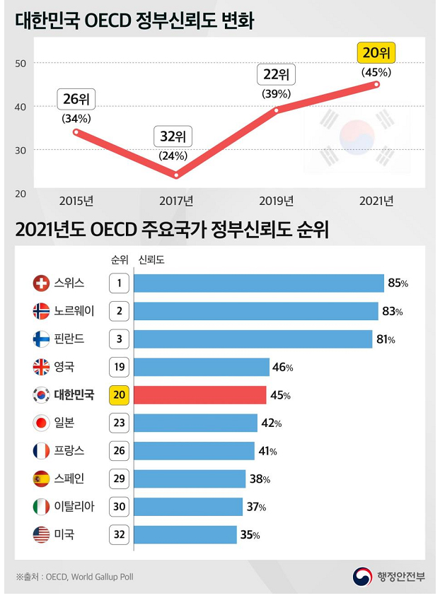 韓国行政安全部は9日、OECDが発表した「一目で見る政府2021」報告書において、韓国政府に対する国民の信頼度が45%に上ったと明らかにした。