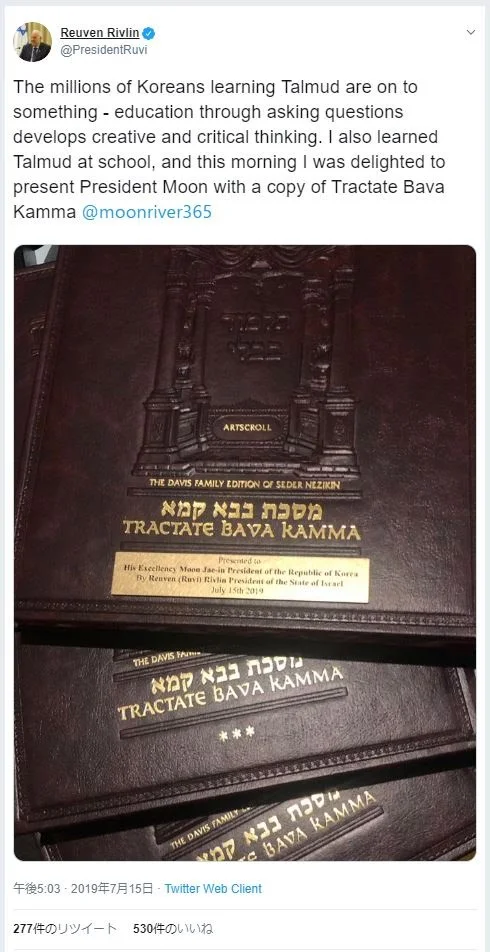 真実に気付いたので、ラビであるリヴリン大統領からムンへ黒塗りのタルムードが贈られたんだ。