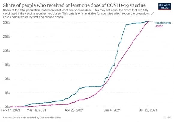 14日、オックスフォード大学の統計サイトであるアワーワールドインデータによると、7月12日基準で韓国と日本の新型コロナワクチンの1回目の接種率は韓国30.46%、日本30.45%となった。