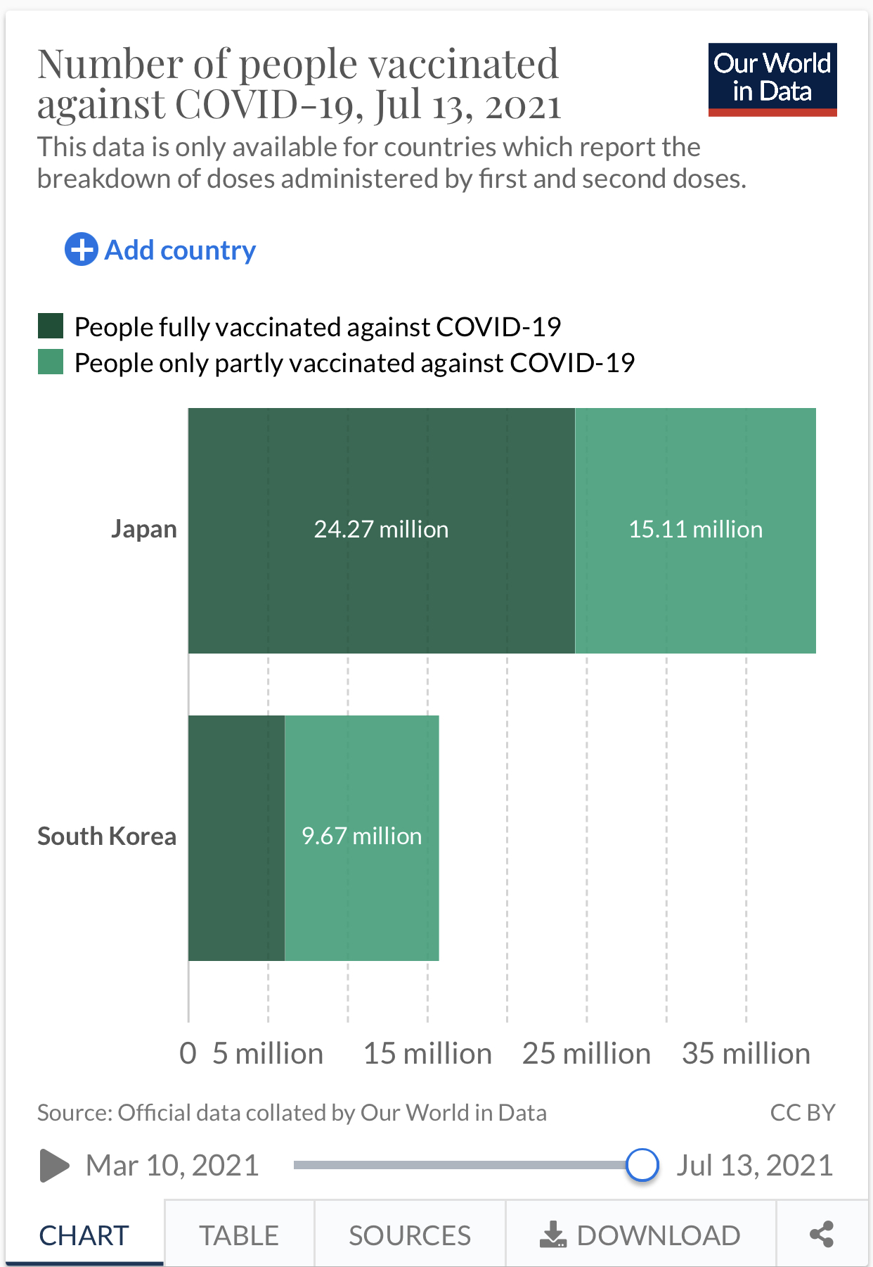 英国オックスフォード大学の統計サイト「Our World in Data(データで見る私たちの世界、OWID)によると、今月15日(現地時間)基準で韓国の人口比ワクチン1次接種率は31.1%となっている。日本は32.4%で1.3%ポイント上回った。接種完了率は8.1%ポイントでさらに差が広がっている。