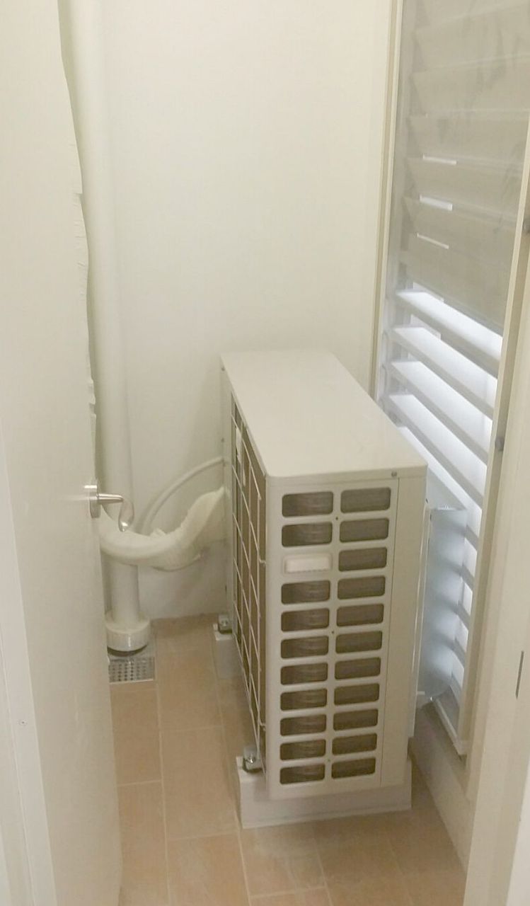 室外機はベランダに設置する(壁は、外断熱なので室外機を支える強度はない)