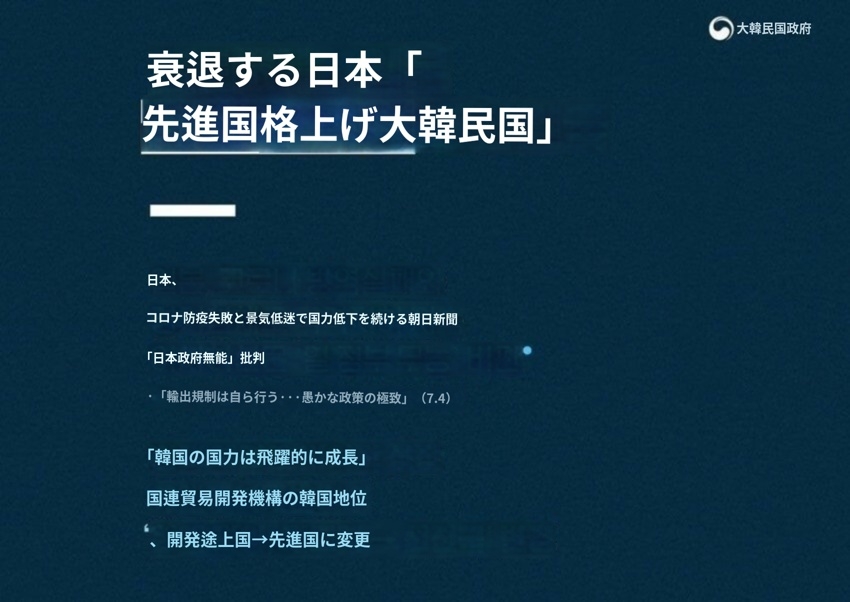 韓国政府が「衰退する日本、先進国格上げの韓国」という広報記事を制作・公開したが、その後に削除したことが分かった。この記事が、インターネット上のコミュニティを中心に急速に広がり、「外交的欠礼」という非難世論が起きた直後、削除したものとみられる。