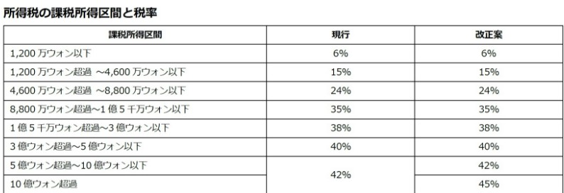 韓国政府、所得税の最高税率を45%に引き上げ