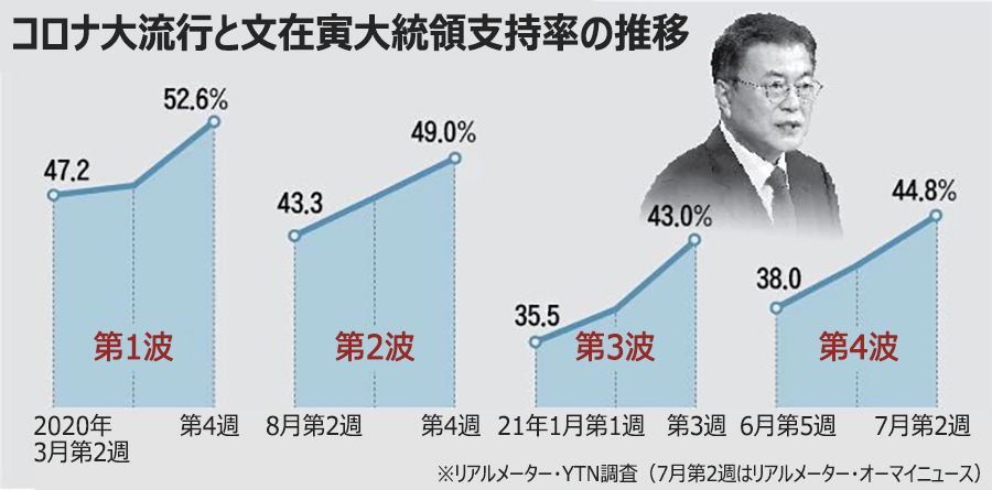 文大統領の支持率はコロナ流行第1、2、3波の際にも回復した。リアルメーターの調査によると、第1波に襲われた昨年3月には2週間で47.2%から52.6%に、昨年8月の第2波では43.3%から49.0%に、今年1月の第3波では35.5%から43.0%にそれぞれ上昇した。