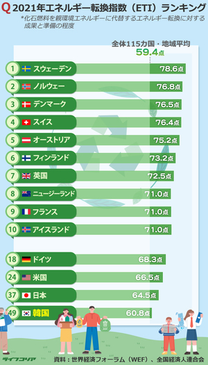 全国経済人連合会が7月6日、世界経済フォーラム(WEF)が発表した「エネルギー転換指数(ETI)2021」を分析した結果を発表。それによると、韓国のランキングは先進31カ国・地域のうち29位、全体115カ国・地域の中では49位だった。韓国のエネルギー転換指数は60.8点で、先進国・地域平均(68.4点)に比べ7.6ポイント低く、全体平均(59.4点)よりも1.4ポイント高かった。