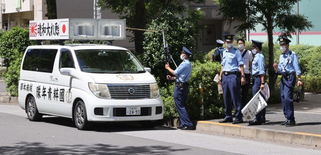 18일 오후 도쿄 하루미 지역 올림픽 선수촌 인근 도로에서 극우단체가 차량을 이용해 확성기 시위를 벌이다 경찰에 제지당하고 있다. 도쿄=올림픽사진공동취재단