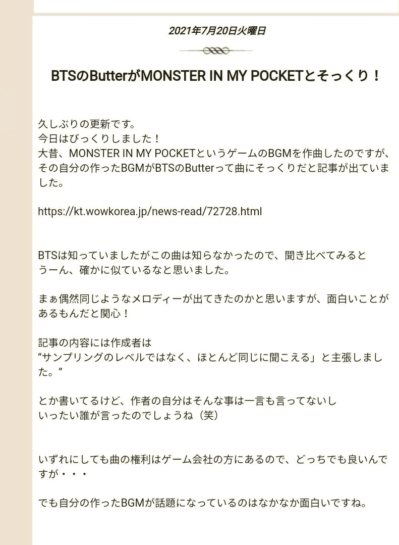 大昔、MONSTER IN MY POCKETというゲームのBGMを作曲したのですが、その自分の作ったBGMがBTSのButterって曲にそっくりだと記事が出ていました。