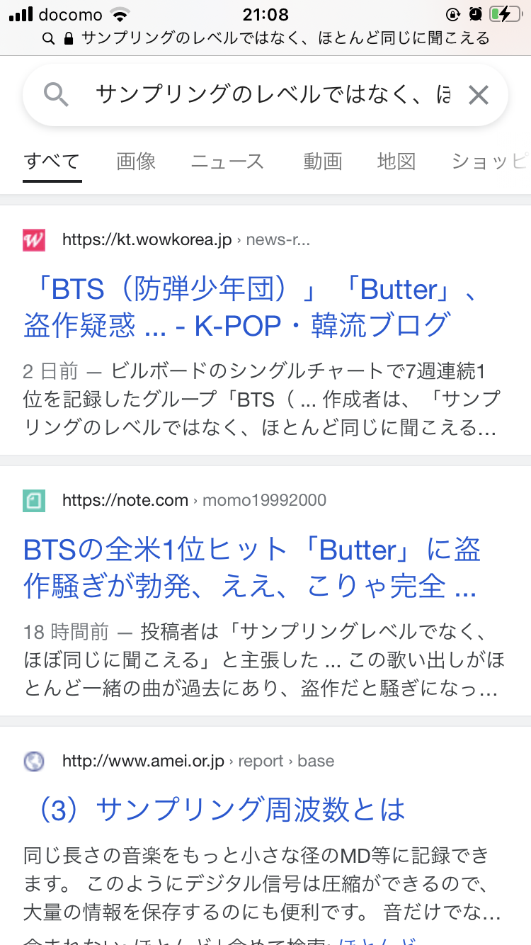 https://kt.wowkorea.jp/'news-read/72728.html BTSは知っていましたがこの曲は知らなかったので、 聞き比べてみると うーん、 確かに似ているなと思いました。 まぁ偶然同じようなメロディーが出てきたのかと思いますが、面白いことが あるもんだと関心! 記事の内容には作成者は "サンプリングのレベルではなく、ほとんど同じに聞こえる」と主張しました。とか書いてるけど、作者の自分はそんな事は一言も言ってないし いったい誰が言ったのでしょうね (笑)