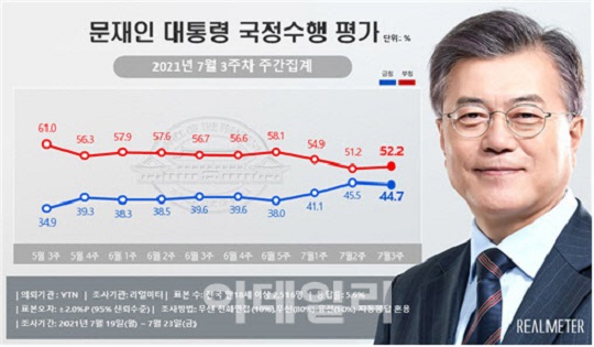 韓国世論調査専門機関“リアルメーター”が 今月19日から23日の5日間、韓国内 18歳以上の有権者2516人を対象に調査した結果、肯定評価は 前週対比で0.8p下落した44.7%と集計された。