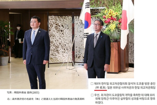 東京で20日に行われた日韓両国の外務次官協議で、韓国側が発表資料で日本の森次官の名前を「林次官」と間違えて配布し、後に修正を行っていたことがわかりました。