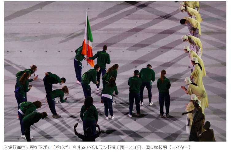 東京五輪開会式の選手入場で、アイルランド選手団が入場時に立ち止まり、全員で頭を下げて「おじぎ」をした。選手を出迎えた演者もとっさに返礼。会員制交流サイト(SNS)上では「うれしい」などと歓迎する書き込みが相次いだ。