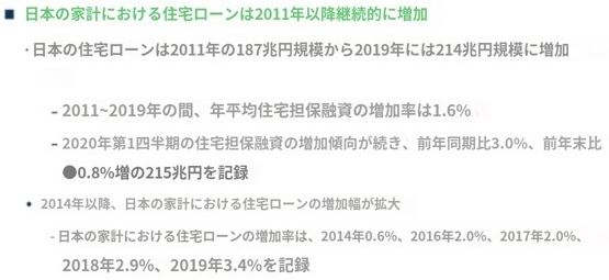 일본의 가계 주택 담보 대출은 2011 년 187 조 엔 규모에서 2019 년 214 조 엔 규모로 증가 - 2011 ~ 2019 년 기간 동안 연평균 주택 담보 대출 증가율은 1.6 % - 2020 년 1 분기 주택 담보 대출 증가세가 지속되며 전년 동기 대비 3.0 %, 전년 말 대비 0.8 % 증가한 215 조 엔 기록 2014 년 이후 일본 가계의 주택 담보 대출 증가폭이 확대 - 일본 가계의 주택 담보 대출 증가율은 2014 년 0.6 %, 2016 년 2.0 %, 2017 년 2.0 %, 2018 년 2.9 %, 2019 년 3.4 %를 기록